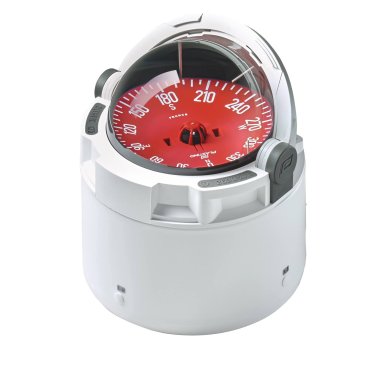 Flushmount compass for steering console or wheel pedestal. Large flat card, ideal when steering standing. 5 years warranty Compass card: flat card, graduated every 5°. Heading numerals every 30°. Hood/sunshade: unique articulated protective hood: built-in sliding cover, composed of 3 telescopic parts. Choice of 2 binnacles (96 mm high)