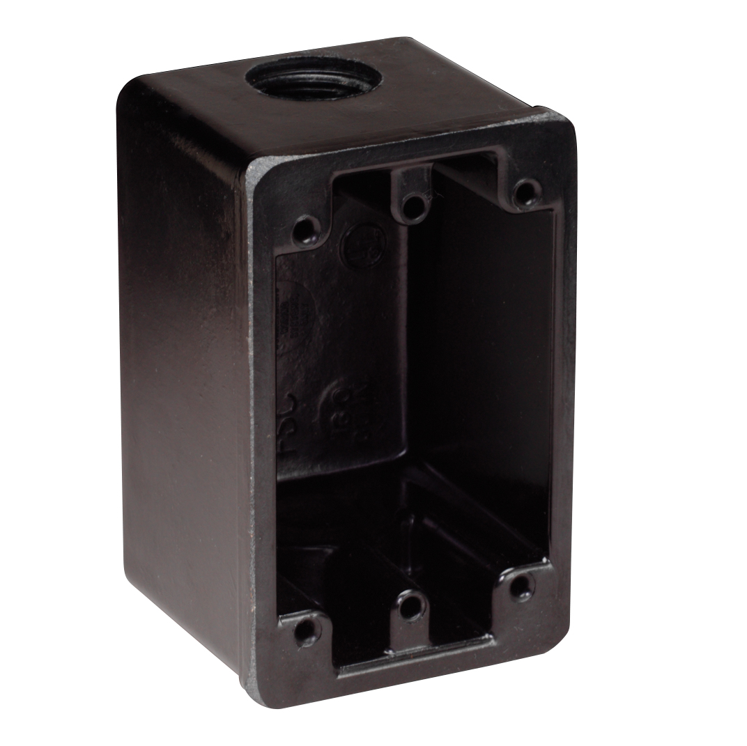 This black non-metallic box with two 3/4″ K.O. holes accepts 15A, 20A and 30A receptacles, and 7420CR weatherproof covers.