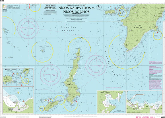 Navigate the waters between Kárpathos and Ródhos with precision and confidence using the Imray Chart G39: Nísos Kárpathos to Nísos Ródhos. This meticulously detailed nautical chart covers the southeastern Aegean Sea, offering crucial information for sailors exploring the Dodecanese Islands and surrounding areas. Renowned for their accuracy and reliability, Imray charts are the preferred choice for mariners seeking safe passage through complex waters.