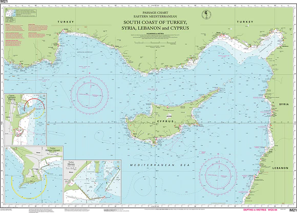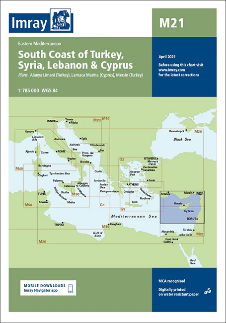 Ensure a safe and memorable voyage through the Eastern Mediterranean with the Imray Chart M21 South Coast of Turkey, Syria, Lebanon, and Cyprus. Order now to equip your vessel with the most accurate and detailed chart for these fascinating maritime regions.