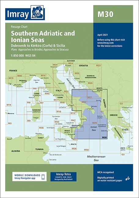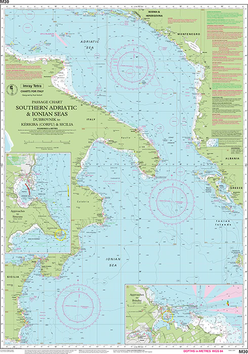 Navigate the captivating waters of the Southern Adriatic and Ionian Seas with the Imray Chart M30 Southern Adriatic and Ionian Seas. Order now to ensure your maritime adventures are guided by the most accurate and detailed chart available for this remarkable Mediterranean region.