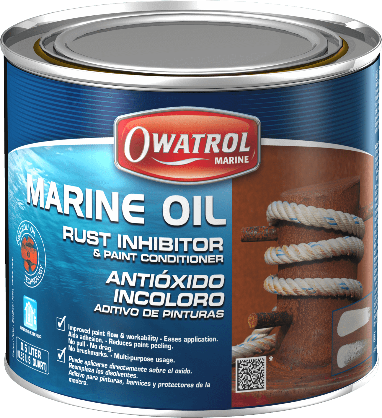 Marine Oil is a versatile, highly penetrating air drying oil that can be used alone or added to paint. Used alone it provides a tough, flexible finish, driving out excess moisture and air; displacing it from rusted metal, so stopping rust. Used alone on porous wood surfaces it will saturate and protect the wood from damage caused by moisture and prevent paint from peeling. Added to any oil or alkyd based coatings Marine Oil will give increased wet edge time, improved flow ability, greater adhesion and unlike damaging thinners, will maintain the inherent quality of the paint without affecting its appearance or drying times. Using Marine Oil as a rust inhibitor Marine Oil penetrates through rusted surfaces to the sound metal below, isolating it and protecting it from further rusting. As it is a penetrating oil it can be used directly on the rusted surfaces – it drives out moisture and air and stabilises the metal to protect it from future damage. On brand new metal surfaces, use Owatrol’s AP 60 instead. If you are looking for a high gloss rusted finish you can also overcoat the surface with Deks Olje D2 high gloss clear oil. Using Marine Oil to aid adhesion Marine Oil leaves a bonding film on all surfaces it is used on which maintains the natural look of the surface but allows enhanced adhesion, making it perfect as a foundation for primers or finishing coats. It gives excellent adhesion including on galvanised steel, aluminium, zinc, wood and more. It allows paint to be applied directly to firm rust and is heat resistant up to +175°C. Using Marine Oil as a paint conditioner Marine Oil can be mixed into oil-based paints as a paint conditioner when several great benefits. Firstly, it gives the paint rust inhibiting properties and helps prevent rust on painted surfaces – even when rust is already present. It also improves the flow and workability of the paint, maintaining the ‘wet edge’ for longer and reducing brush and roller marks. Finally, it also gives the paint a better viscosity which allows painting work to be carried out in more extreme cold, heat and windy conditions, perfect for the marine environment. Unlike damaging paint thinners it does not alter the inherent qualities or the finish of the paint. Please note that if you are looking for a product to give this effect but for water-based paints then please use Floetrol instead as it is designed for use in any water-based paint whereas Marine Oil is for use in oil-based paints. Using Marine Oil for wood impregnation When used on dry wood surfaces Marine Oil saturates the wood and protects it from damage caused by moisture. It also helps to prevent paint from peeling and protects metal parts such as hinges and latches from corrosion. Ideal Uses for Marine Oil