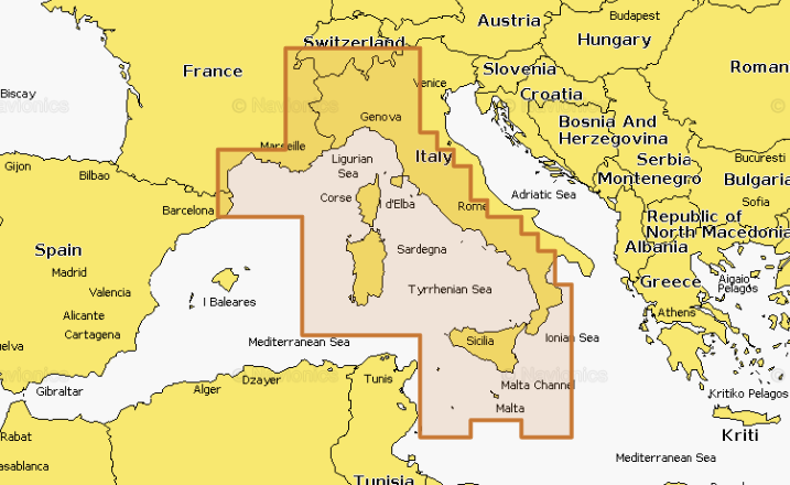 Coastal coverage of the Mediterranean coast from L’Esartit, Spain to Crotone, Italy including Corsica, Sardinia, Sicily, and Malta. Also includes coverage of Lac de Geneve, Lago Maggiore, Lago di Lugano, Lago d’Iseo, Lago di Como and Lago di Garda in northern Italy.