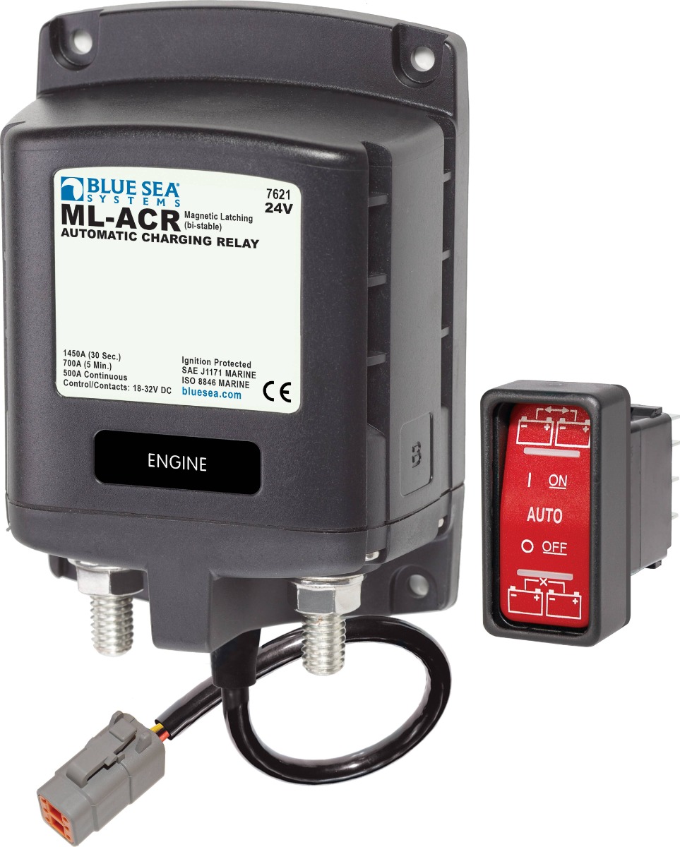500 Amp magnetic latching (bi-stable) relay automatically combines batteries during charging and isolates batteries when discharging and when starting the engine
