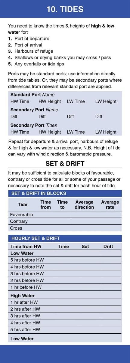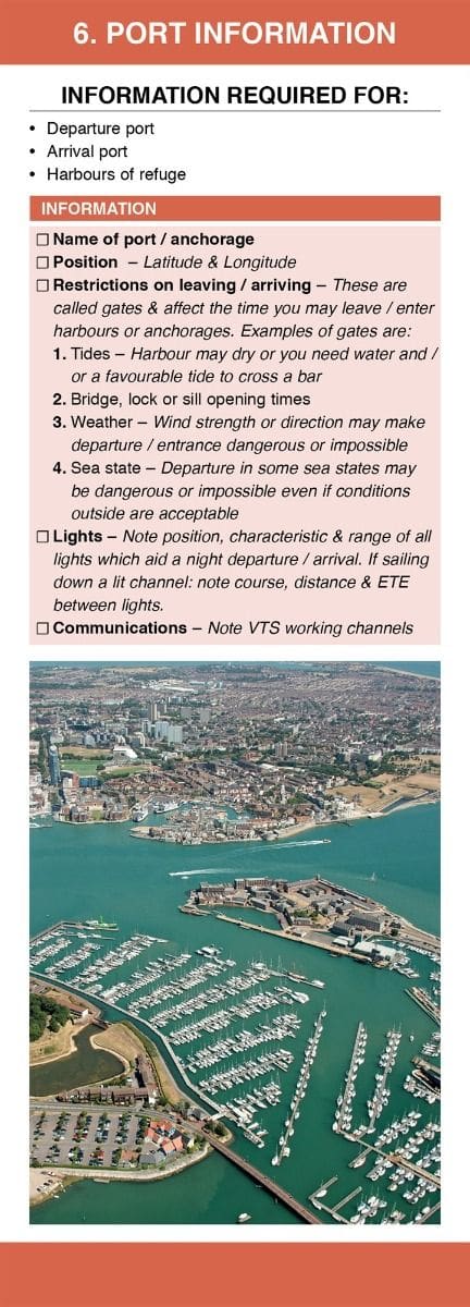 This is your guide to writing a clear, easily understood, logical passage plan. Topics covered include routing, pilotage, points of departure, landfalls, weather, tides, currents, safe havens, lights, communications, watch keeping, safety, rations, fuel supplies, stowage for sea, and crew briefing.