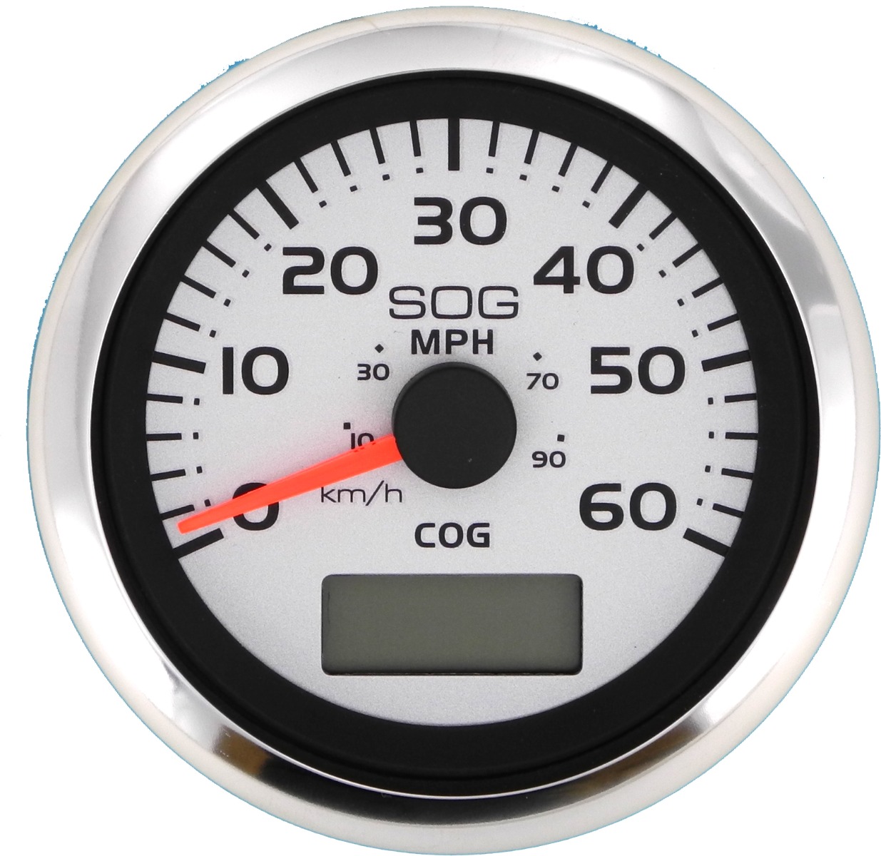 Black graphics on a silver background, pointer has black hub with fade resistant acrylic orange staff. Pointer is internally illuminated for excellent night visibility. Dial graphics light red when illuminated and anti scratch glass lens with fog resistant coating and polished stainless steel bezel.