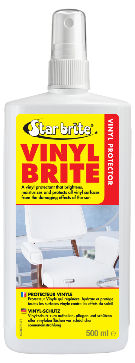 Vinyl surface should be free of all dirt, grease or wax. Clean surface with Star brite® Vinyl Shampoo or Star brite® Boat Wash, rinse off and allow surface to dry thoroughly. Apply a thin even coat of Vinyl Brite with sprayer, a lint free cloth or a sponge. Allow Vinyl Brite to penetrate surface then buff off excess. For greater, longer lasting protection apply a second coat. Vinyl Brite will leave your vinyl with a bright, tough water resistant finish. Repeat process as often as necessary to keep vinyl looking new.